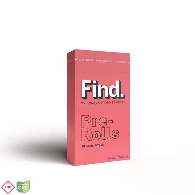 FIND Flower Preroll 10 pack provides convenience on the go. Ready to be smoked and available in Indica, Sativa and Hybrid – Strain Specific.